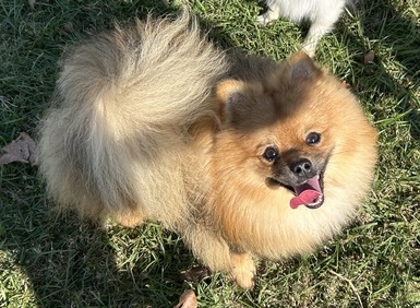 Zeus is a solid white pom and weighs only 4 lbs. He is a Fun boy that loves to run and play.