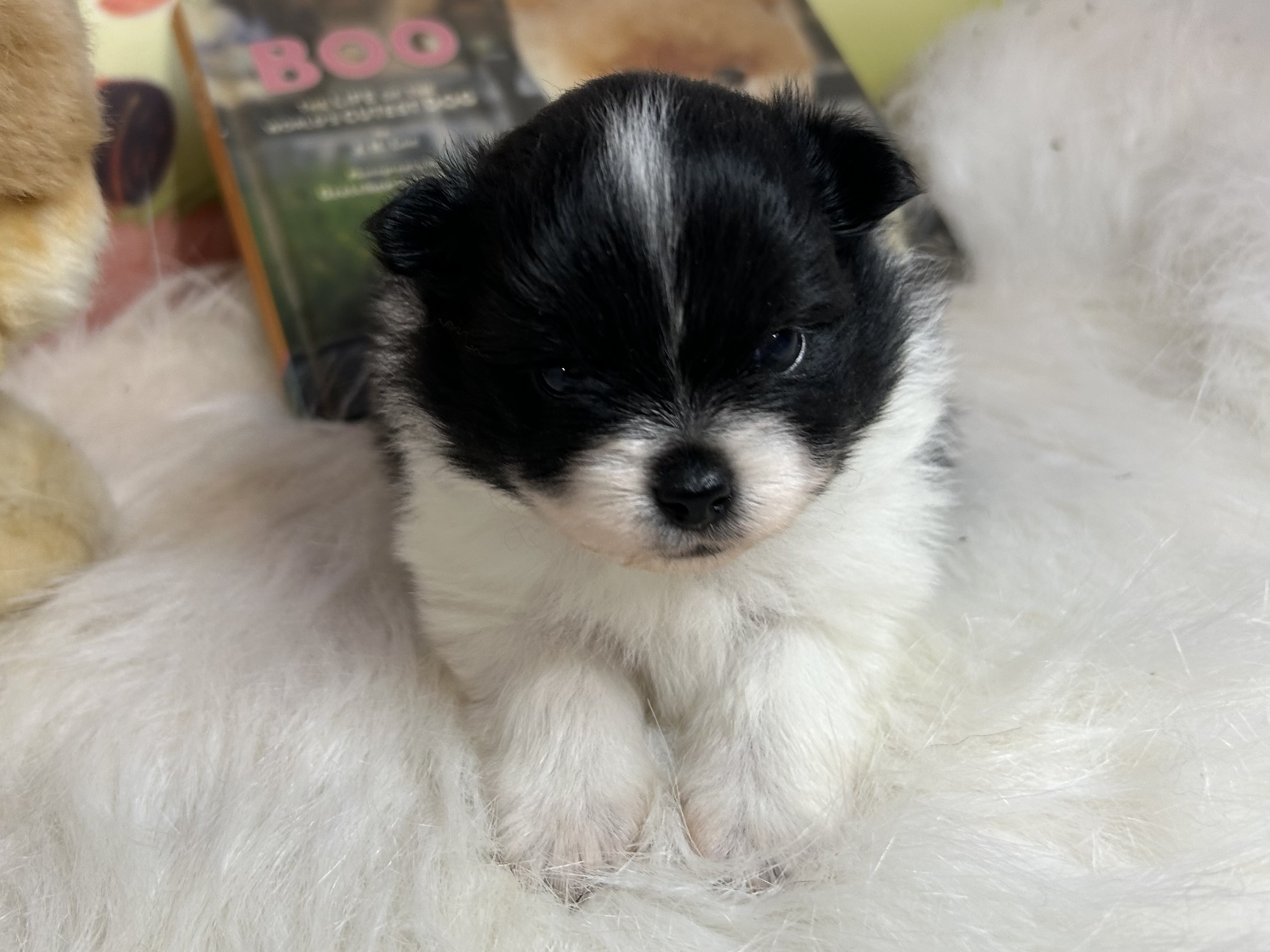 Black and White parti girl from Cappuccino and Zeus. Teddy bear face. She has a sweet personality and beautiful markings. She will be ready to go home October 31st
